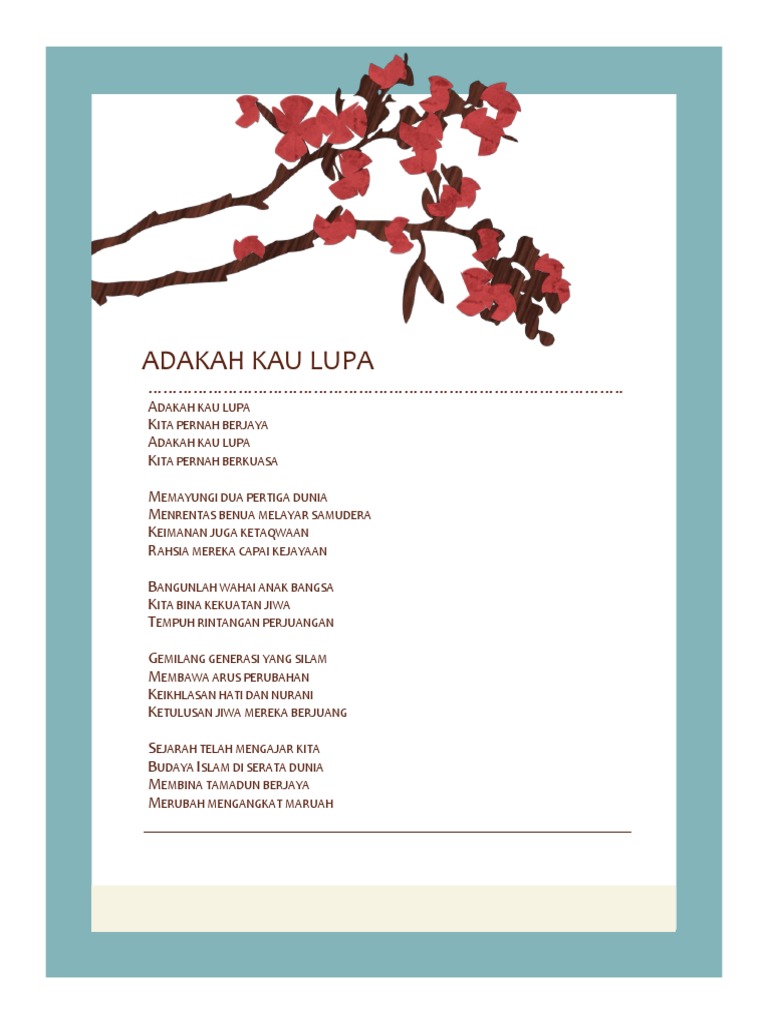 Ketikkan nama penyanyi dan judul lagu berikan tanda kutip di judul lagu misal. Lirik Hati Siapa Tak Luka dari Poppy Mercury ini dipublikasikan pada tanggal 1 April 2011 11 tahun yang laluBelum ada info detil tentang single ini. Adakah kau lupa Kita pernah berjaya Adakah kau lupa Kita pernah berkuasa Memayungi dua pertiga dunia Menrentas benua melayar samudera Keimanan juga ketaqwaan Rahsia mereka capai kejayaan Bangunlah wahai anak bangsa Kita bina kekuatan jiwa Tempuh rintangan perjuangan Gemilang generasi yang silam Membawa arus perubahan Keikhlasan hati dan.